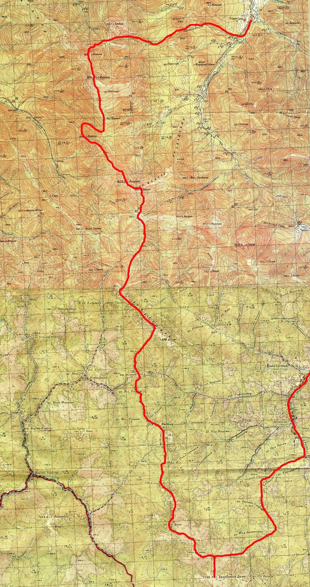 Ивано-Франковск – село Старая Гута – река Кузьминец - полонина Середня – гора Высокая(1803м) – гора Игровец(1804 м) – полонина Боревка – гора Боревка – гора Лопушна – гора Большая Сивуля(1836 м) –полонина Рущина – урочище Пекло – полонина Пантырь – гора Дурня – гора Гропа – гора Братковская(1788 м) – река Гропинец – Климпуши-село Быстрица – Ивано-Франковск