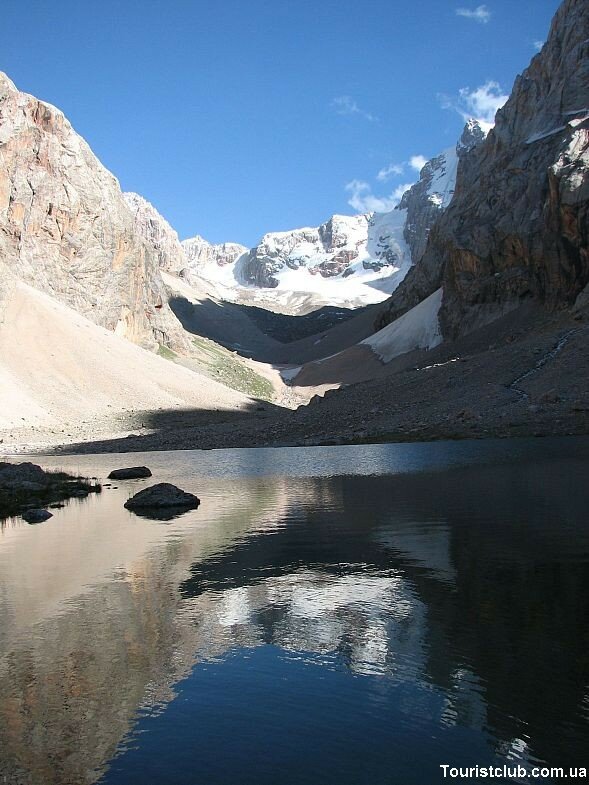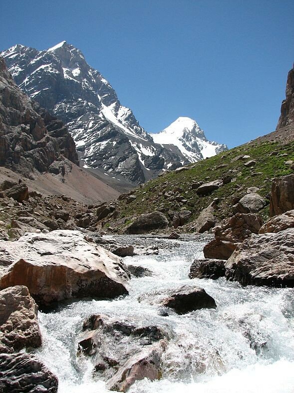 Первы 5 дней похода мы будем идти налегке, наши вещи будут везти ослы. Утром хорошо натоптанная тропа поведёт вас по осыпному склону вдоль речки к озеру Бибиджанат, которое входит в состав Куликалонских озер. По пути перед вами откроются три вершины - Адамташ, Мирали и Мария, венчающие одну из скальных стен Куликалонской котловины. Куликалонские озера – это цепь из десятка малых и больших разноцветных озёр, переливающихся друг в друга, вытекающих в большое Куликалонское озеро. Неописуемо красивый цирк этих чудесных озёр с южной стороны обрамляется высокими пиками с ледниками и снежниками. Добравшись до Бибиджаната, вы разобьёте лагерь и после обеда совершите прогулку к живописному озеру Дюшаха, расположенному у подножия пятитысячника Мирали.